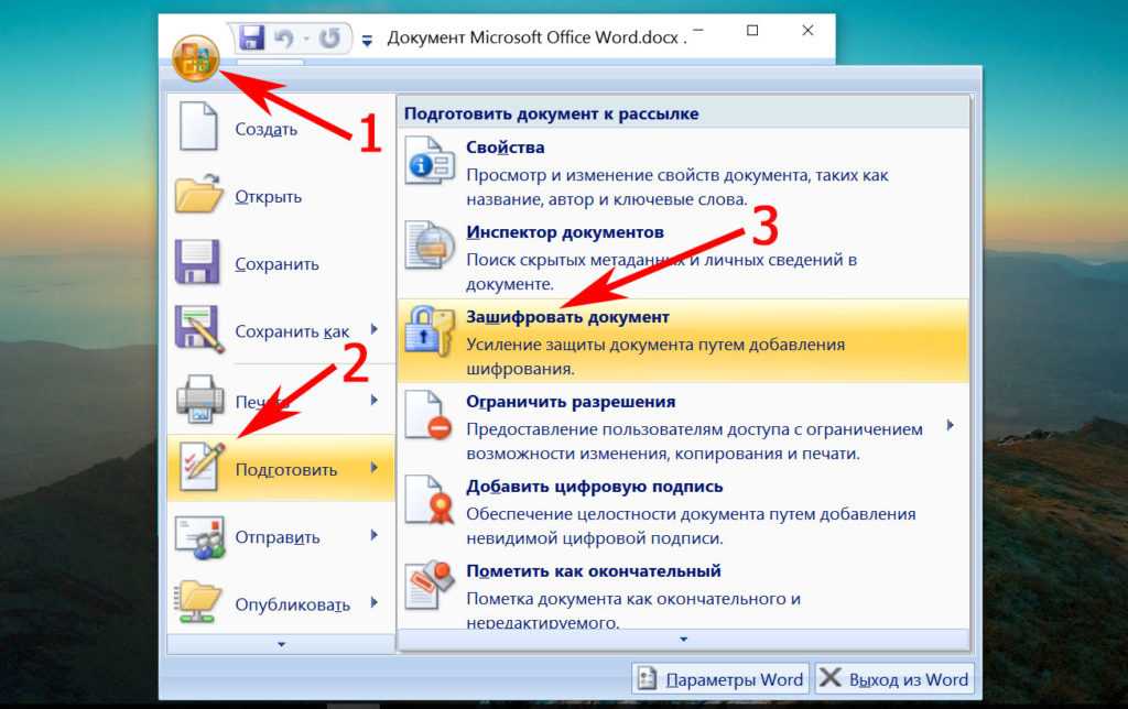 После создания файла Word или Excel войдите в меню «Офиса». Далее нажмите на «Подготовить», раскроется подменю, где выбираем «Зашифровать документ».