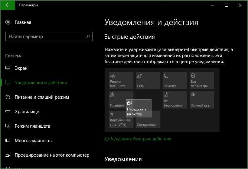 - Из полученного списка выбирают «Быстрые действия» и находят нужную секцию, помогающую изменить параметры яркости монитора.