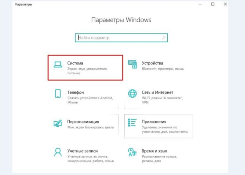 - Щёлкните по пиктограмме «Система» в окне «Параметры».