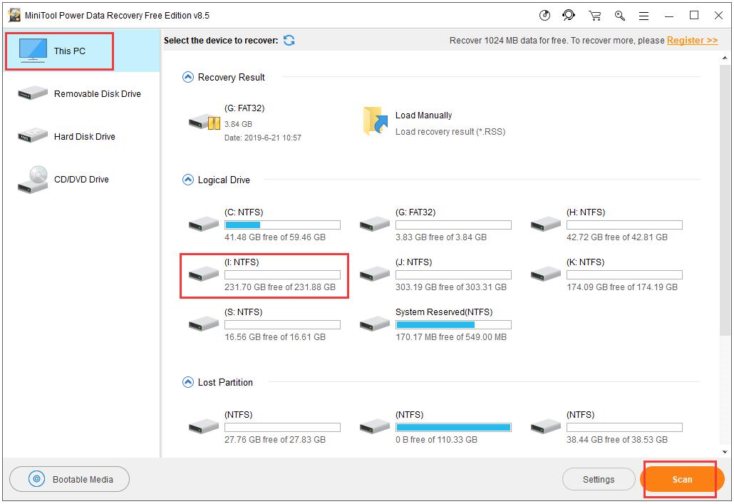 Run MiniTool Power Data Recovery Free. In the main interface, you can click This PC, and choose one partition which may contain lost files.