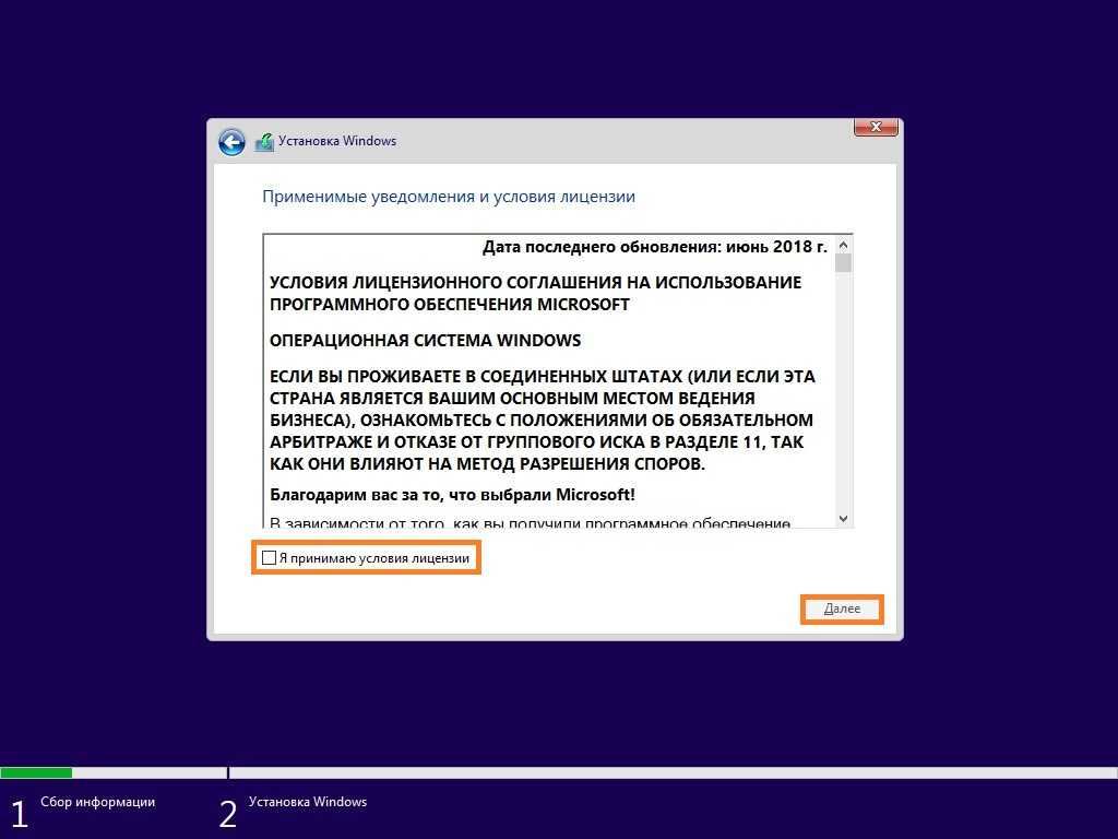На следующем окне перед Вами предстанет лицензионное соглашение Windows 10. Для продолжения установки, его нужно принять (поставив галочку на пункте «Я принимаю условия лицензии»), и нажать кнопку «Далее» (оба пункта выделены оранжевым на картинке ниже).