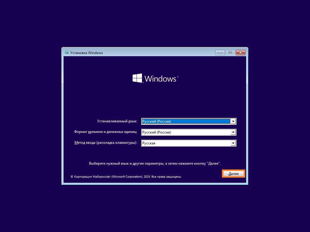 Компьютер стартует с загрузочного накопителя. Первым действием инструмент установки системы предложит вам определить язык, формат денежных единиц и приоритетную раскладку клавиатуры. Нажмите «Далее».