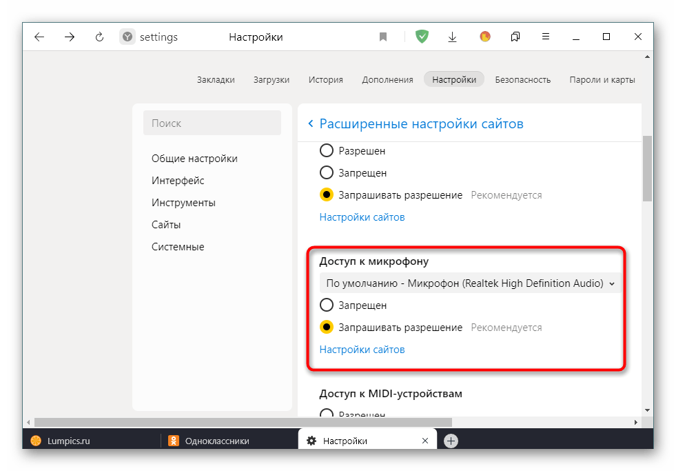Установите для параметра Доступ к микрофону значение Разрешено или Запросить разрешение. При необходимости вы можете выбрать целевое устройство из списка и даже перейти к дополнительным параметрам, чтобы добавить Одноклассники в список исключений и больше никогда не получать уведомления о доступе к компьютеру.