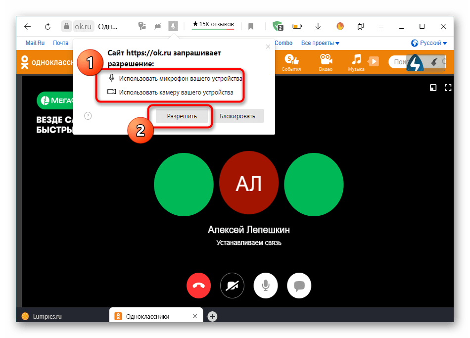 При начале звонка на экране появится сообщение о том, что сайт «Одноклассники» запрашивает разрешение на использование микрофона и камеры. Эти два устройства теперь будут взаимодействовать одновременно, поэтому им сразу предоставляется доступ. Просто нажмите кнопку «Разрешить».