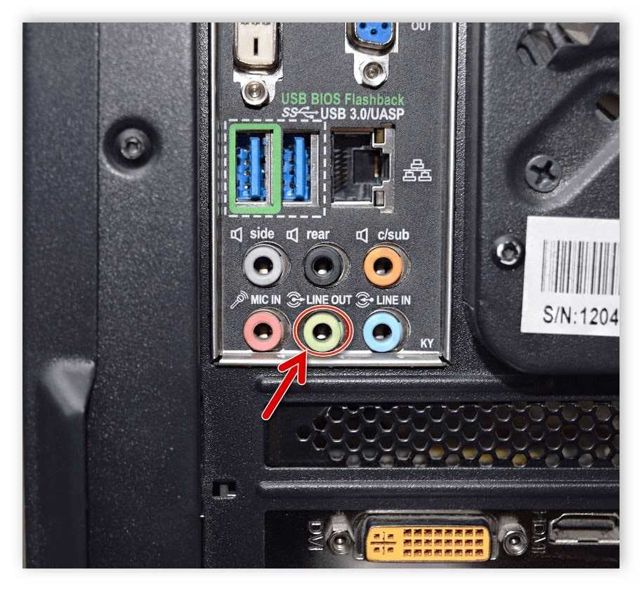 Решение неполадки — воткнуть штекер обратно. Однако на задней крышке есть зачастую 3 или 6 разъемов. Для колонок необходимо использовать зеленый — line out (линейный выход). На ноутбуках нет цветовой разметки. Вместо этого там нарисованы иконки: микрофон, колонки или наушники. Если используется внешняя звуковая карта — воткнуть провод в нее (на разных моделях расположение портов отличается).