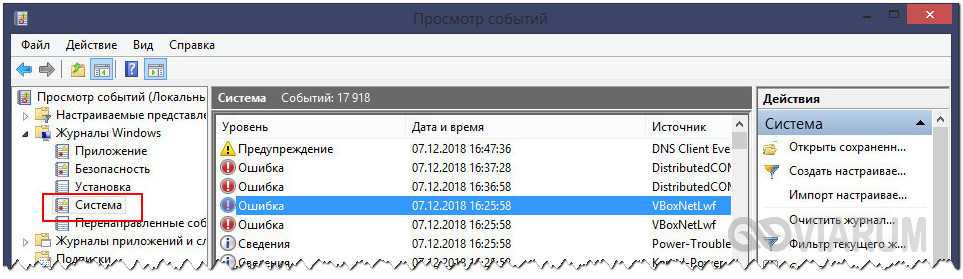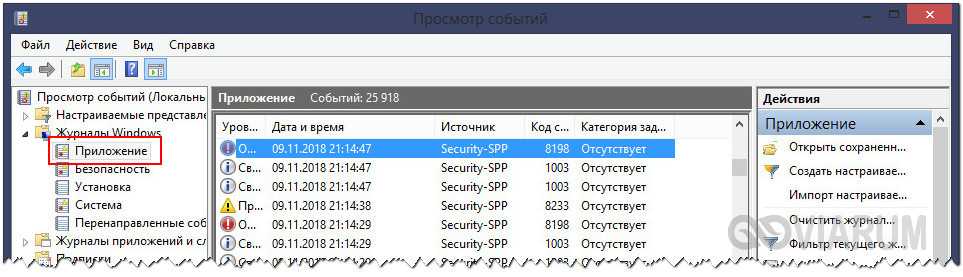 В журнале Windows стоит просмотреть два отсека: «Система» и «Приложения». Если хоть один из процессов отмечен сообщением об ошибке, то его необходимо отключить.