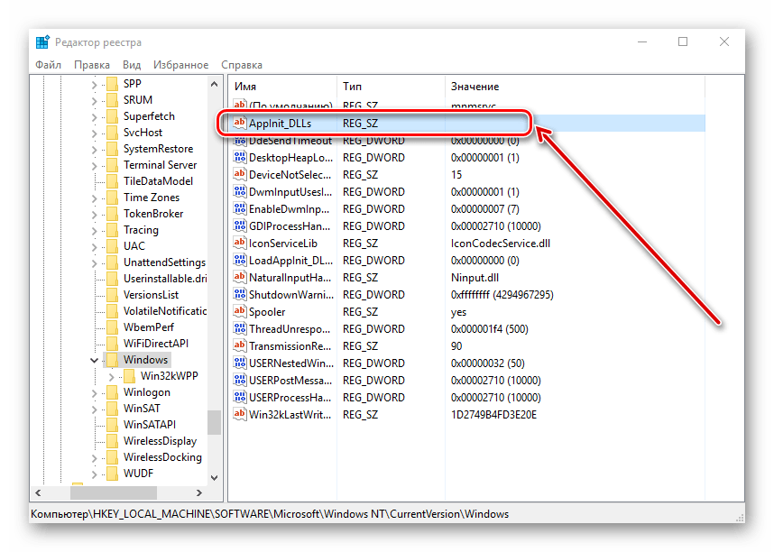 Запустится редактор реестра, где нужно перейти по следующему пути: HKEY_LOCAL_MACHINE\SOFTWARE\Microsoft\Windows NT\CurrentVersion\Windows\