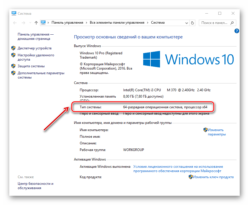 Запустится окно «Система», где нужно обратить внимание на пункт «Тип системы». В данном случаем у нас 64-разрядная ОС.