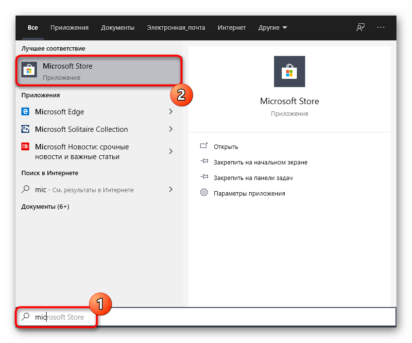 Через поиск в «Пуск» отыщите «Microsoft Store» и запустите этот магазин.