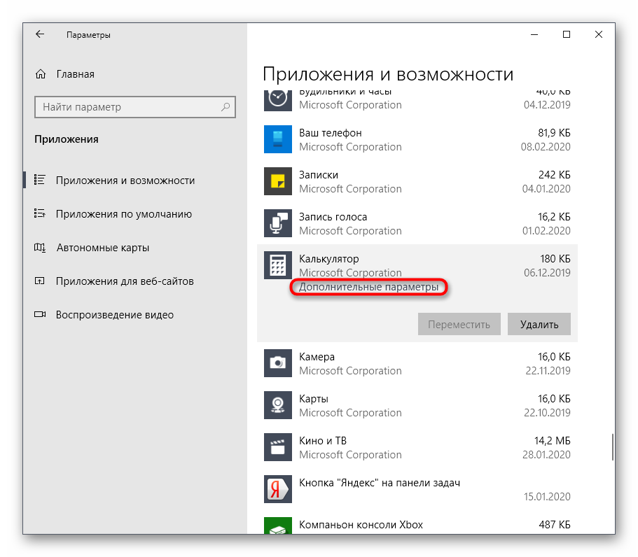 Далее найдите пункт «Приложения и возможности» и в списке найдите калькулятор.