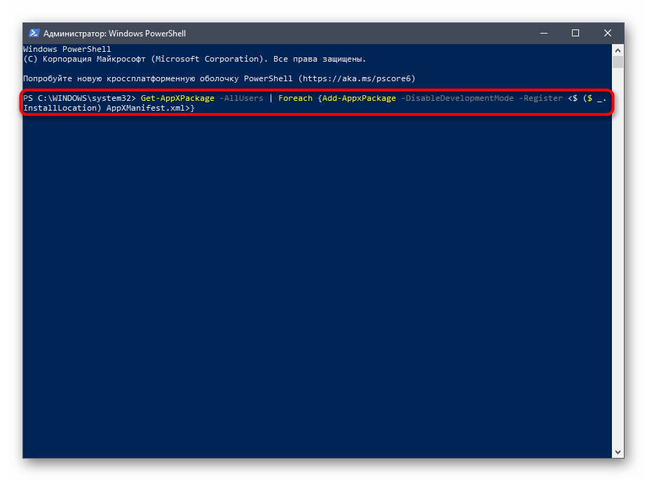 После этого остается только ввести команду Get-AppXPackage -AllUsers | Foreach и нажать по клавише Enter. Сразу же начнется переустановка компонентов. Не закрывайте окно и дождитесь появления информации об успешном завершении процедуры.