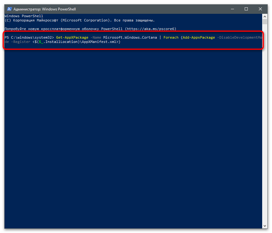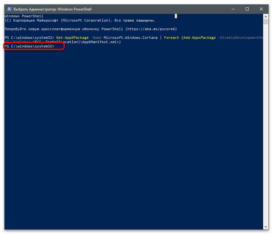 Если вы все-таки используете Кортану и вариант с ее отключением не подходит, попробуйте восстановить ее, используя специальную команду в PowerShell. Никаких сложностей в реализации этого способа нет, с чем вы можете убедиться далее.