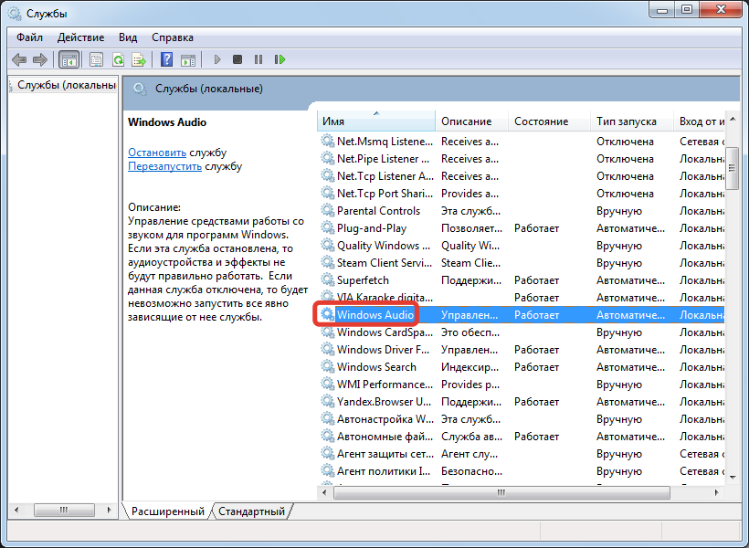- В списке отыскать строку Windows Audio, вызвать свойства двойным нажатием мыши.