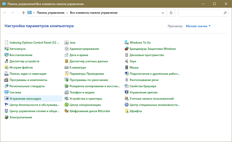 В панели управления выберем «Крупные значки», затем «Устранение неполадок».