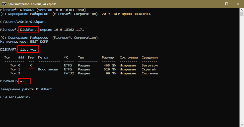 - Сначала необходимо узнать, какую букву имеет системный диск (она может отличаться от привычной). Для этого требуется ввести следующие команды:
