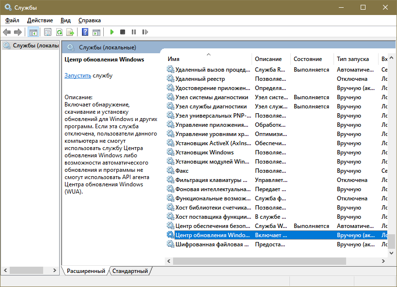 - Нужно также временно отключить службу, которая отвечает за обновления. Делается это вот так: