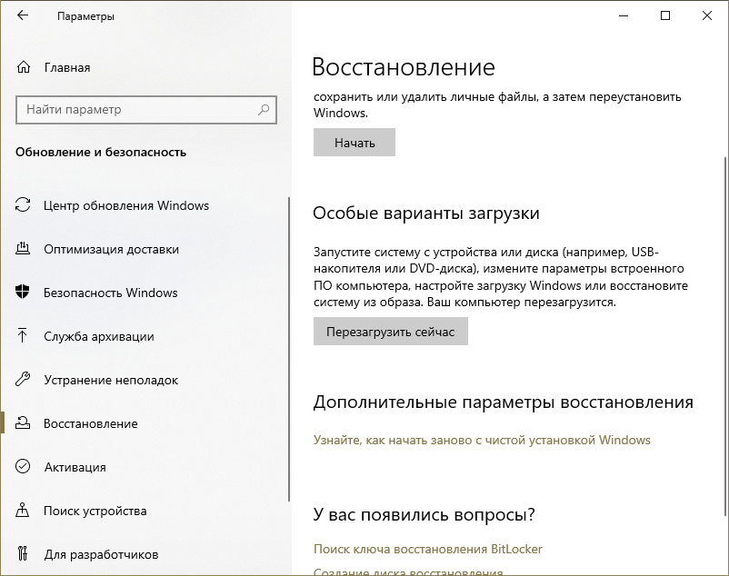 - В подразделе «Восстановление» необходимо найти пункт, отвечающий за другие варианты загрузки. Там будет всего одна кнопка, на которую и нужно нажать.