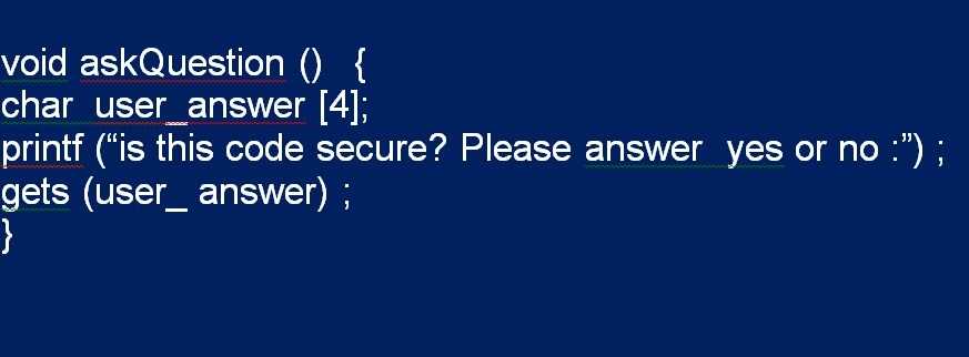 Глядя на код, видно, что проверка границ не выполняется. Если пользователь вводит «возможно», то программа будет аварийно завершать работу, а не запрашивать у него ответ, который записывается в buffer независимо от его длины. В этом примере, поскольку user answer является единственной объявленной переменной, следующие значения в стеке будут значением обратного адреса или местом в памяти, куда программа вернется после выполнения функции ask Question.