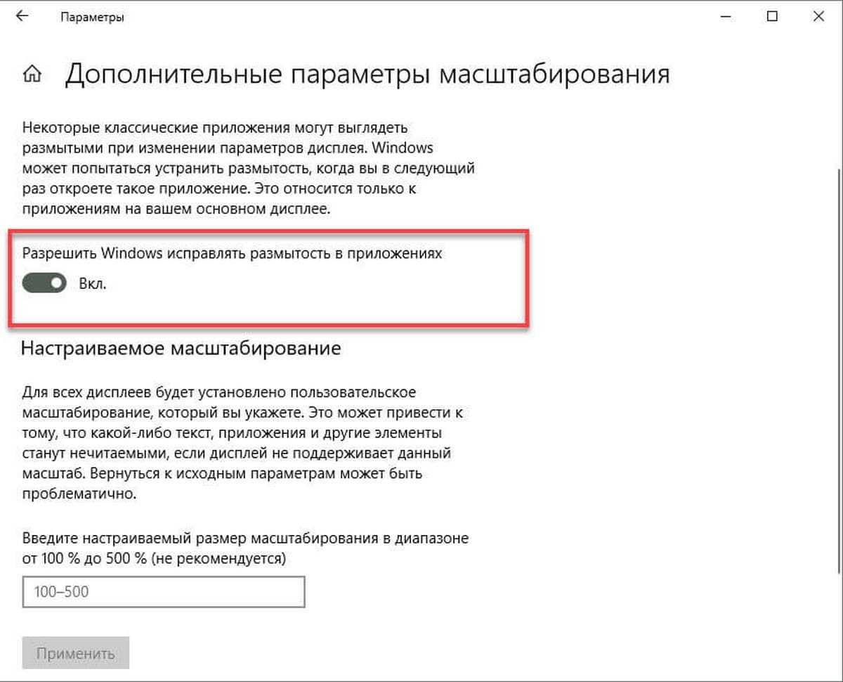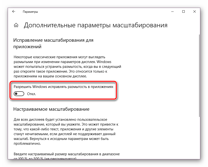 - В текущем местоположении активируем пункт Разрешить Windows исправлять размытость в приложениях перетянув ползунок в положение Вкл.