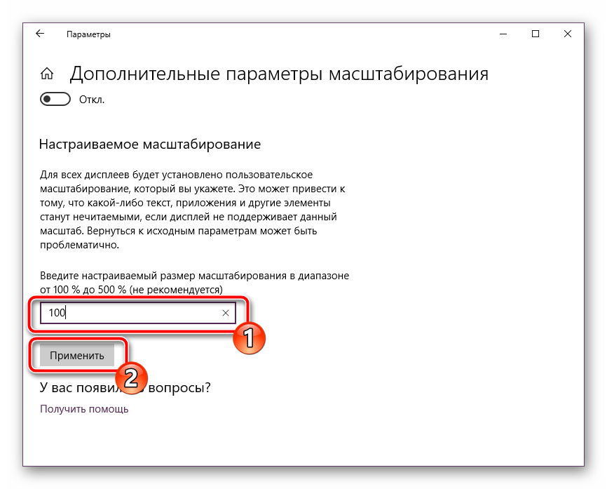 В меню «Дополнительные параметры масштабирования» также присутствует инструмент, позволяющий вручную задать масштаб. О том, как перейти в указанное выше меню, читайте в первой инструкции. В этом окне вам нужно лишь опуститься немного ниже и выставить значение равное 100%.