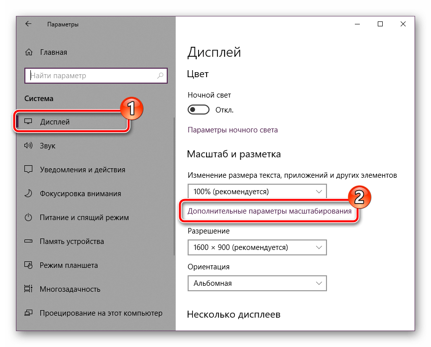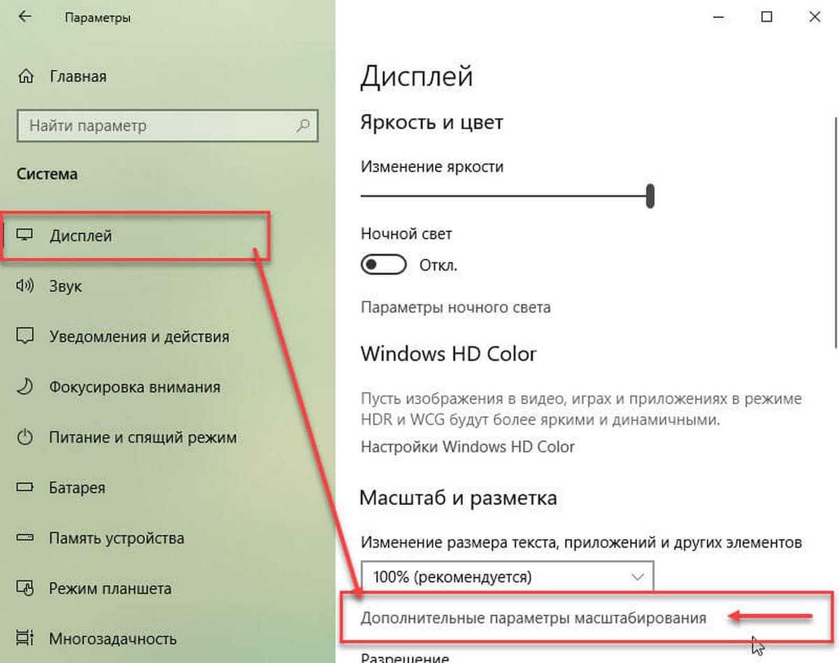 - Переходим в Пуск > Параметры > Система > Дисплей > Дополнительные параметры масштабирования.