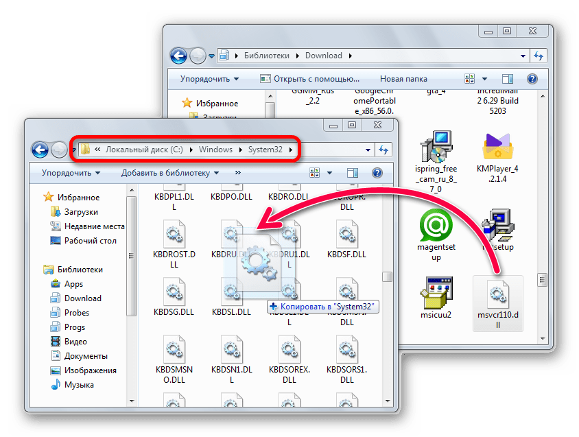 Чтобы без дополнительных программ решить проблему с msvcr110.dll, потребуется её загрузить и переместить в папку: