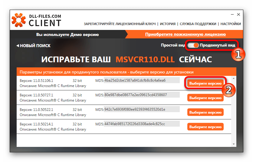 - Выбрать вариант msvcr110.dll и нажать «Выберите версию».