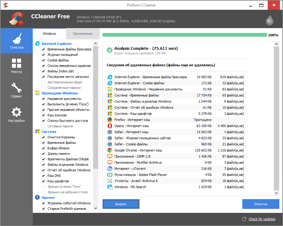 Также рекомендуется воспользоваться такими программами, как CCleaner для проверки и исправления ошибок системы и реестра. Скачать ее можно с официального сайта производителя. После установки ПО достаточно выбрать нужные компоненты для проверки и нажать кнопки «Анализ», а затем «Очистка».