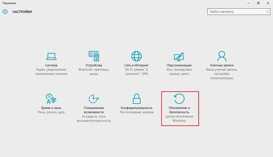 Перейдите на главной странице окна приложения во вкладку «Обновление и безопасность» , используя стандартные способы перемещения по списку доступных вариантов настроек.