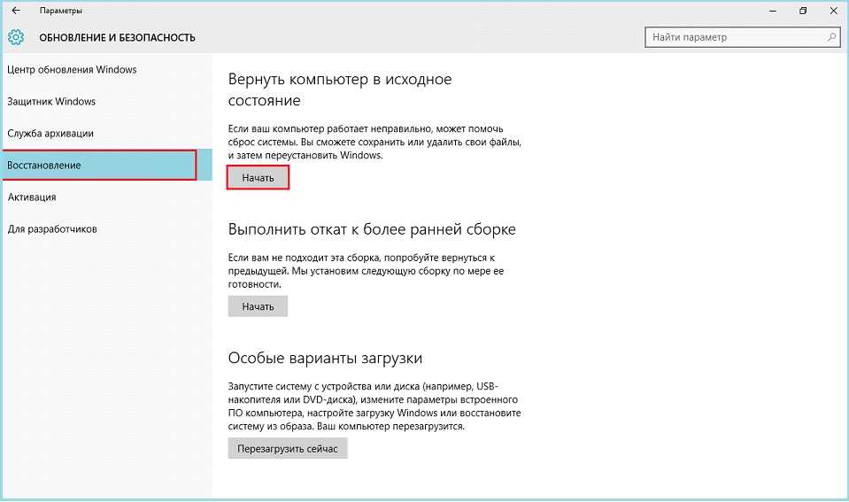 Вкладка «Восстановление» запустит нужный инструмент, переходим на нее и кликаем «Начать».