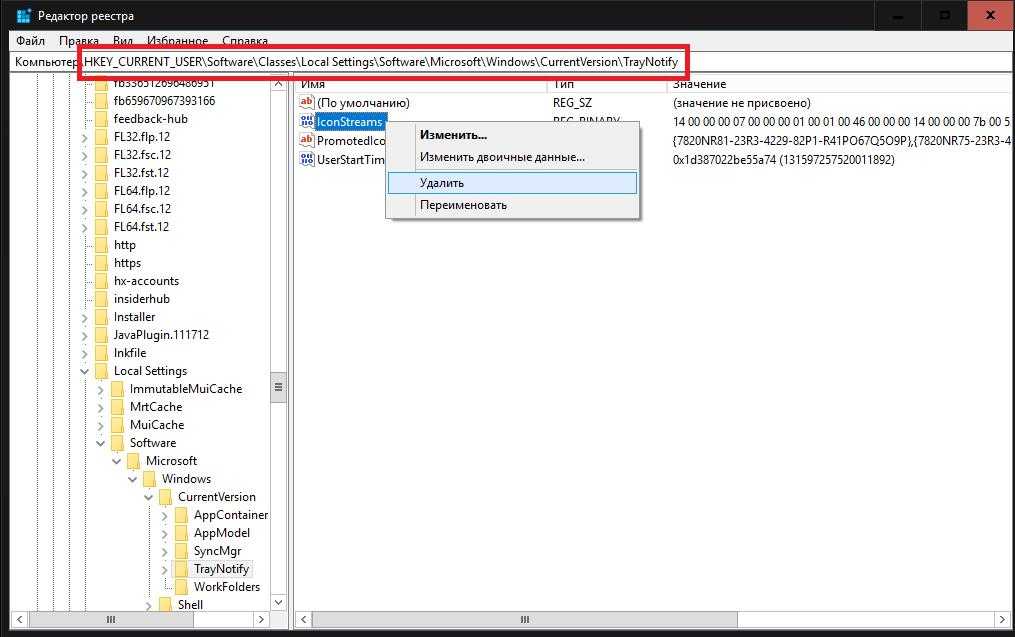 В первом случае в ветке HKCU необходимо найти раздел TrayNotify, как показано выше, а справа в окне удалить ключи IconStream и PastIconStream. Если какого-то из них там не окажется, ничего страшного.