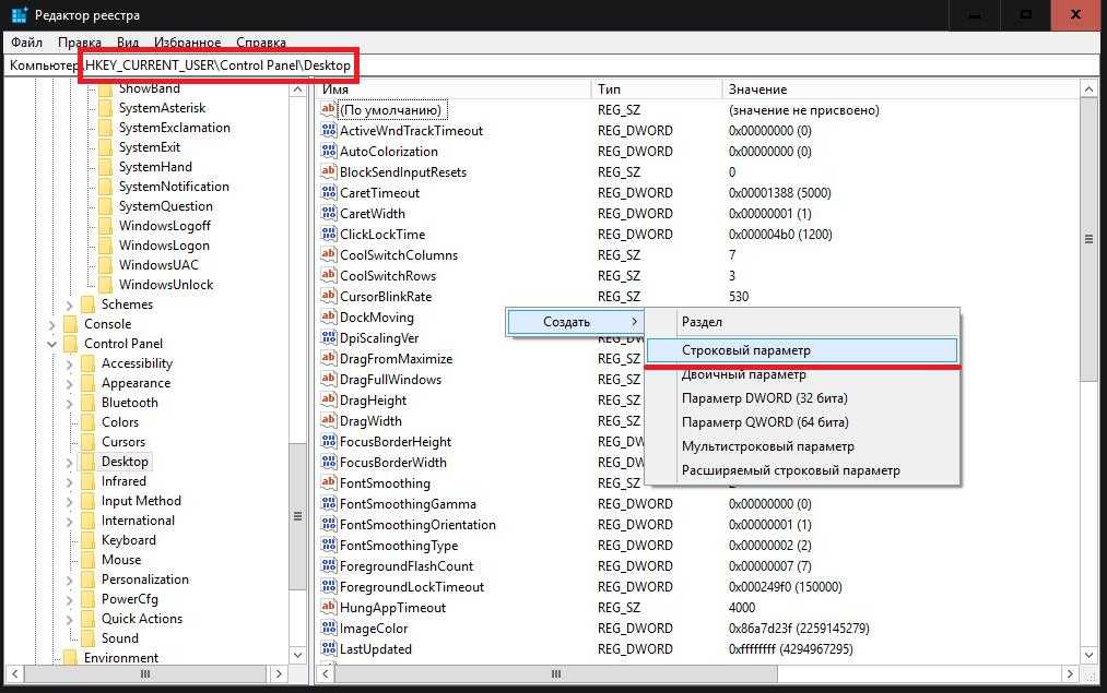- Откройте подкатегорию реестра HKEY_CURENT_USER/Control Penel/Dasktop
