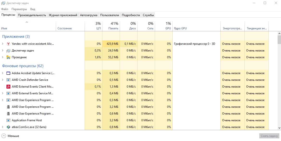 Открываем диспетчер задач (ctrl + shift + esc или правой кнопкой на панели задач внизу — пункт диспетчер задач) и переходим на вкладку процессов. Здесь нас интересуют процессы, которые потребляют больше всего памяти и процессорного времени.